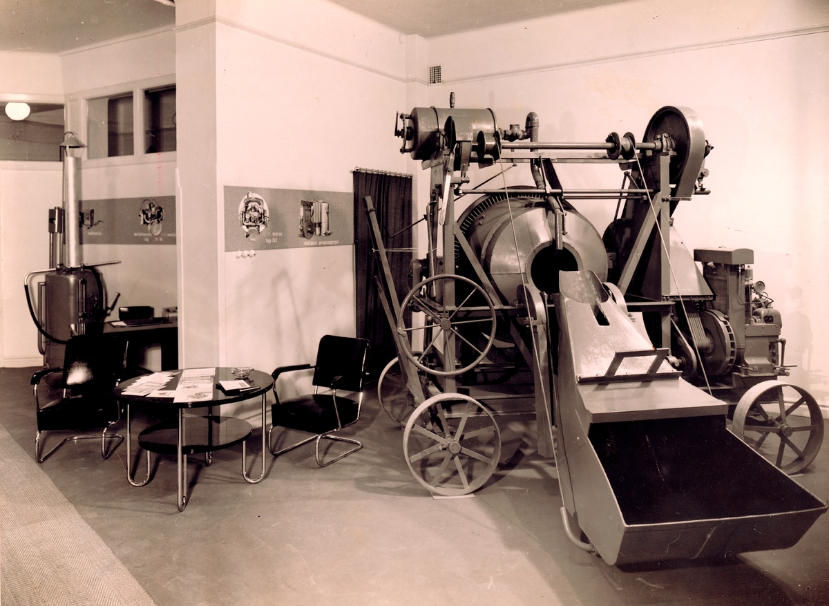 Berg & Co Mekaniska Verkstads AB i Lindesberg utställning på Vasagatan 5, Stockholm, som öppnades i maj 1941. Bilden visar bland annat en betongblandare av vid tiden en ny konstruktion.