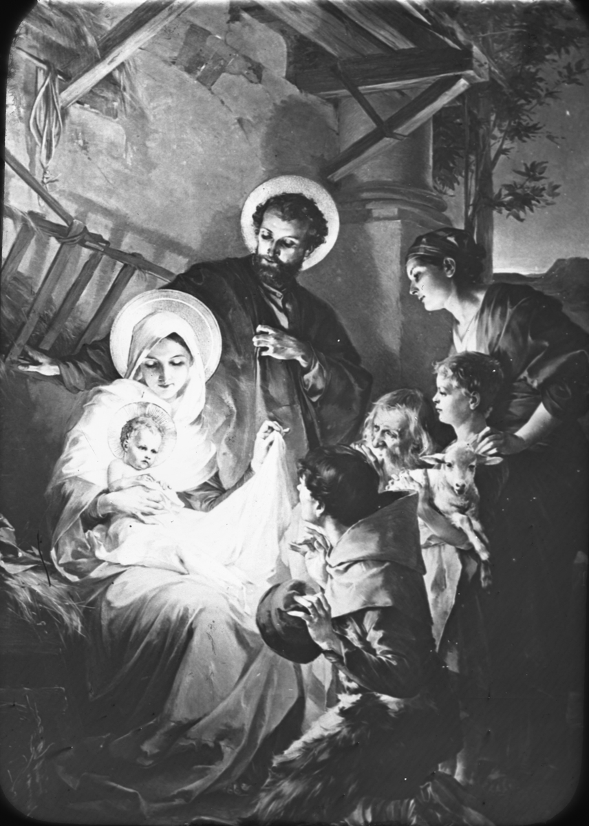 Skioptikonbild. Religiös bild. Maria och Josef med Juseusbarnet.