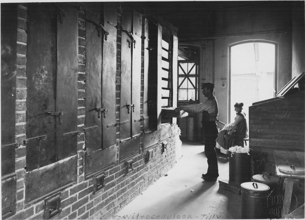 AB Bofors Nobelkrut. Tillverkning av bomullskrut (nitrocellulosa). Man ser hur bomullen uppluckras för hand för att sedan läggas in i torklådor i värmeskåpen. Fuktighetshalten minskar genom torkningen från ursprungligen c:a 8 % till omkring 0,5 %.