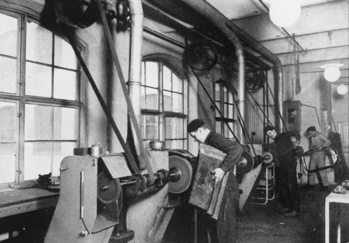 Skioptikonbild med motiv från yrkesinspektionens undersökningar på olika arbetsplatser. Okänd verkstadsmiljö.