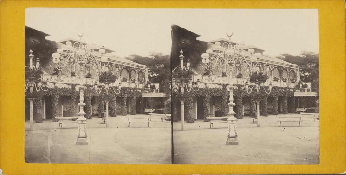 Stereobild med motiv av byggnad med klätterväxter på fasaden. Kan möjligtvis vara en restaurang.