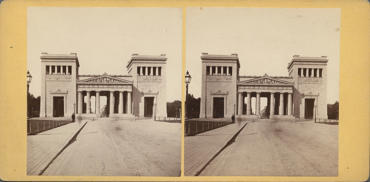 Stereobild med motiv av stenportal, Königsplatz i München.