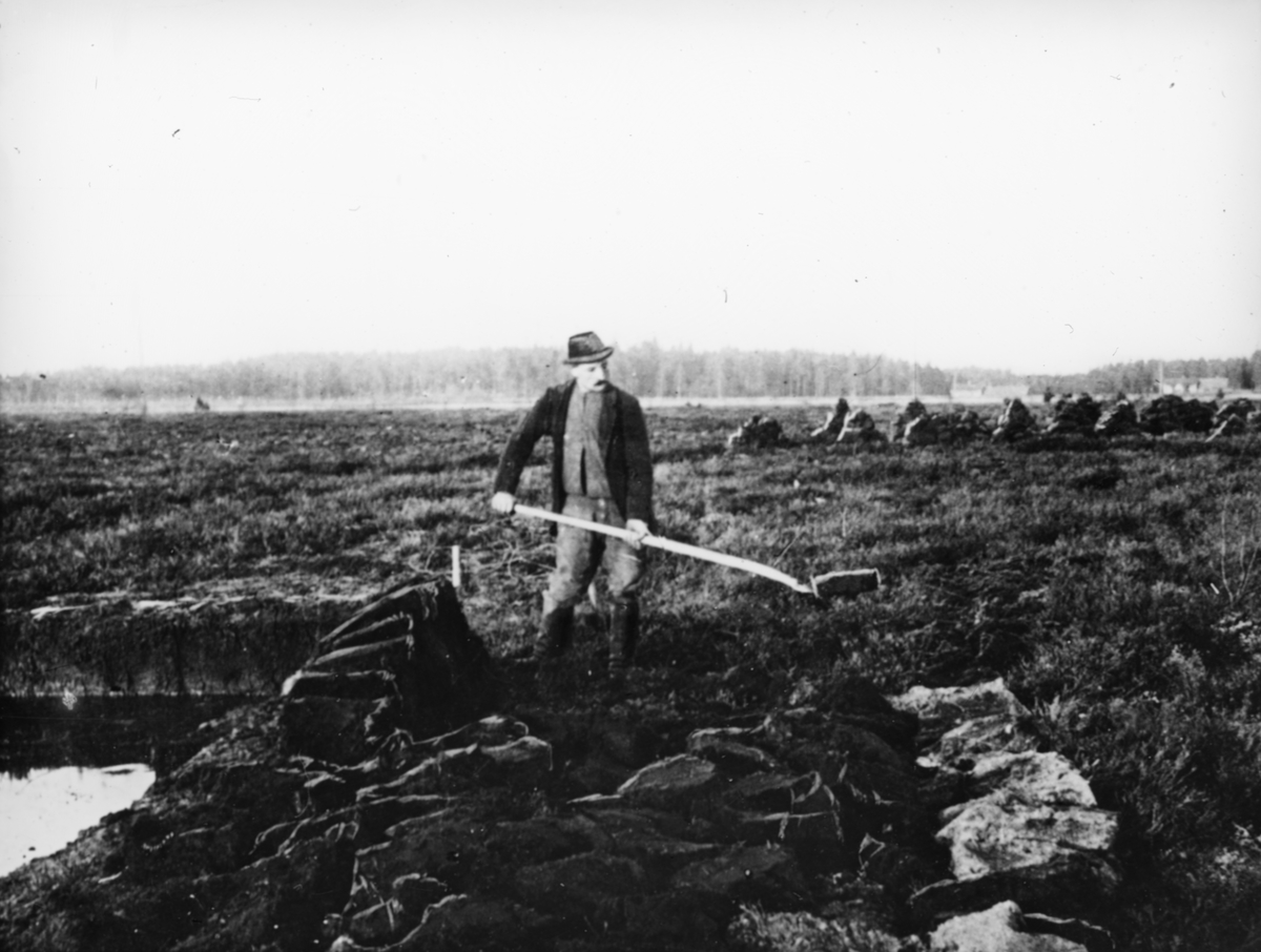 Skioptikonbild med motiv av arbetande man på torvmosse.