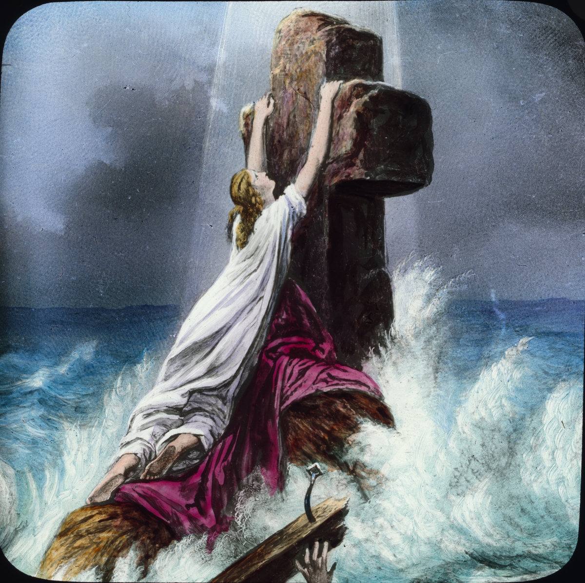 Kolorerad skioptikonbild med religiöst motiv. Skeppsbruten kvinna på kors.