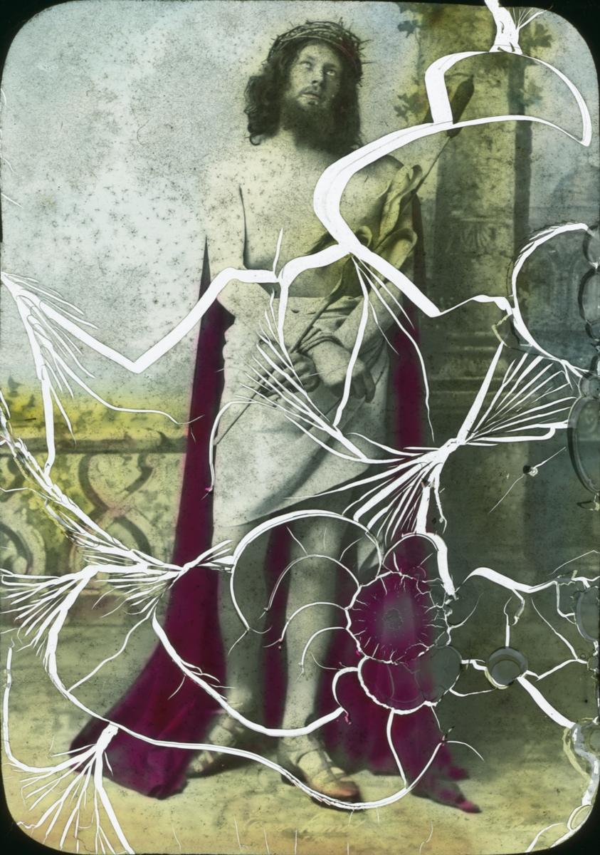 Kolorerad skioptikonbild med religiöst motiv. Jesus med törnekronan.
