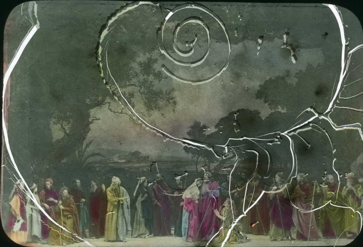 Kolorerad skioptikonbild med okänt motiv. Scannad pga dess nedbrytning.