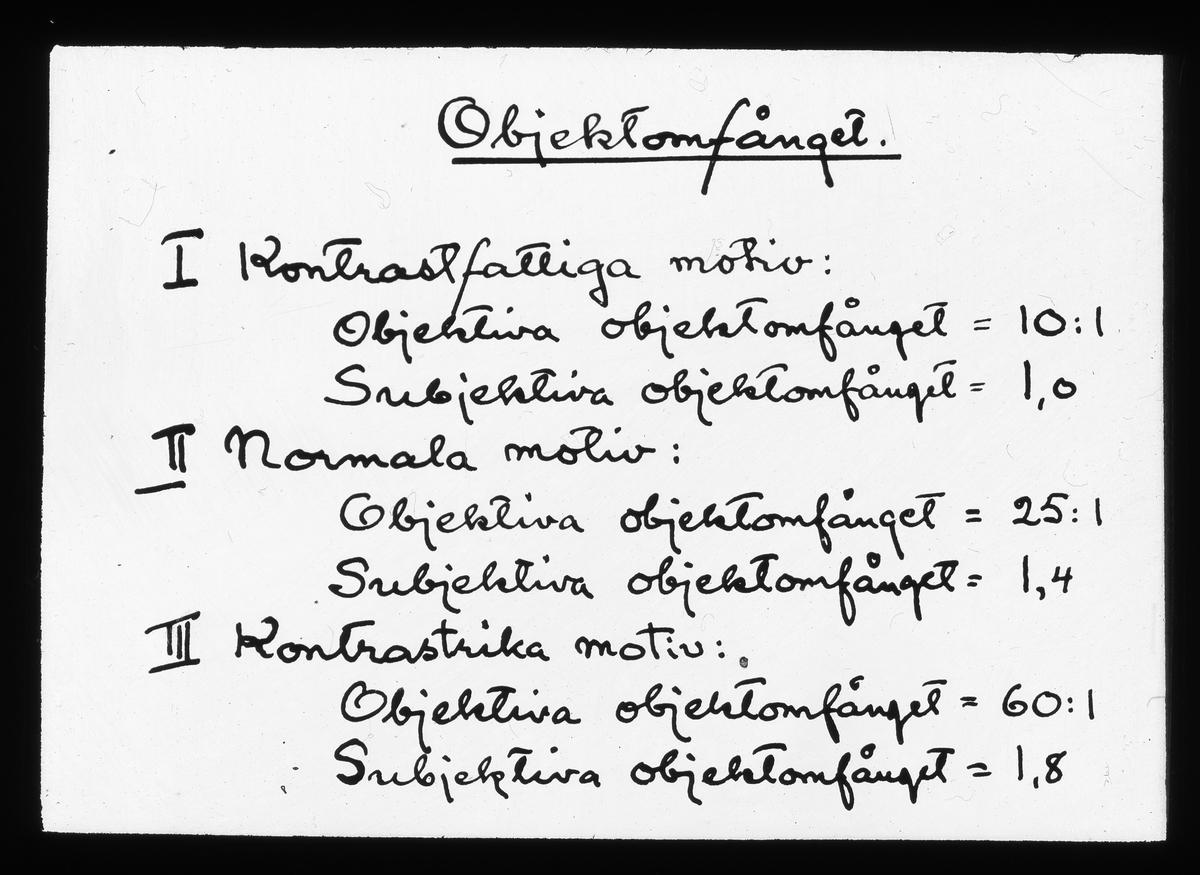 Skioptikonbild från Institutionen för fotografi vid Kungliga Tekniska Högskolan. Använd av professor Helmer Bäckström som föreläsningsmaterial. Bäckström var Sveriges första professor i fotografi vid Kungliga Tekniska Högskolan i Stockholm 1948-1958.