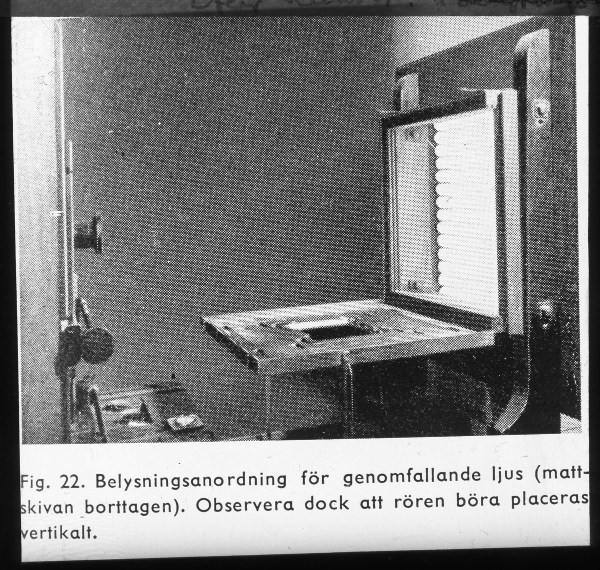 Skioptikonbild från Institutionen för fotografi vid Kungliga Tekniska Högskolan. Använd av professor Helmer Bäckström som föreläsningsmaterial. Bäckström var Sveriges första professor i fotografi vid Kungliga Tekniska Högskolan i Stockholm 1948-1958.