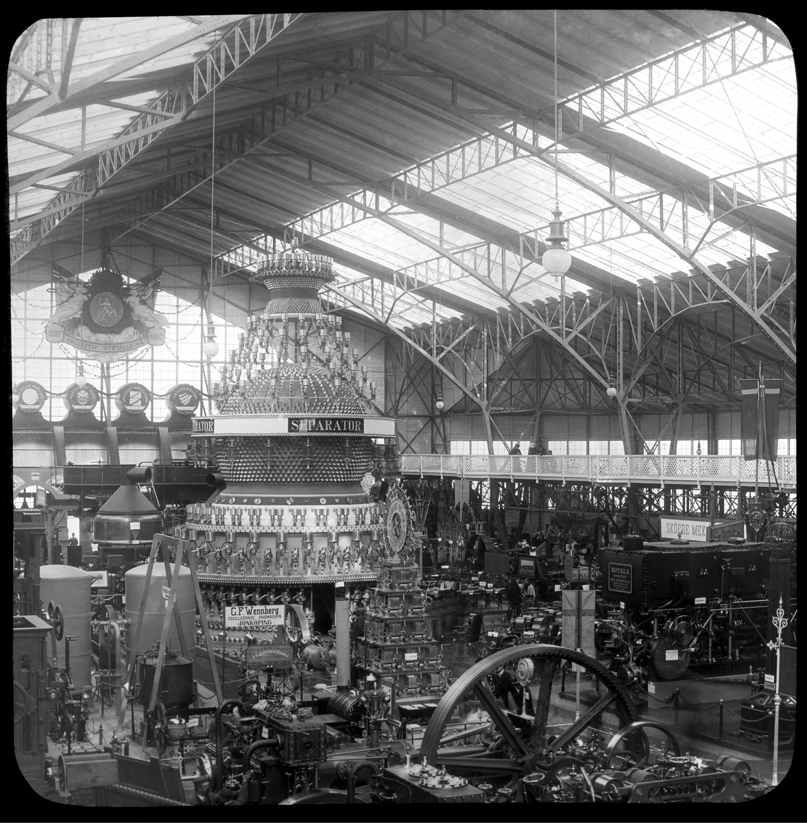 Skioptikonbild med motiv från Allmänna Konst- och Industriutställningen i Stockholm 1897. På bilden syns bland annat AB Separators monter.