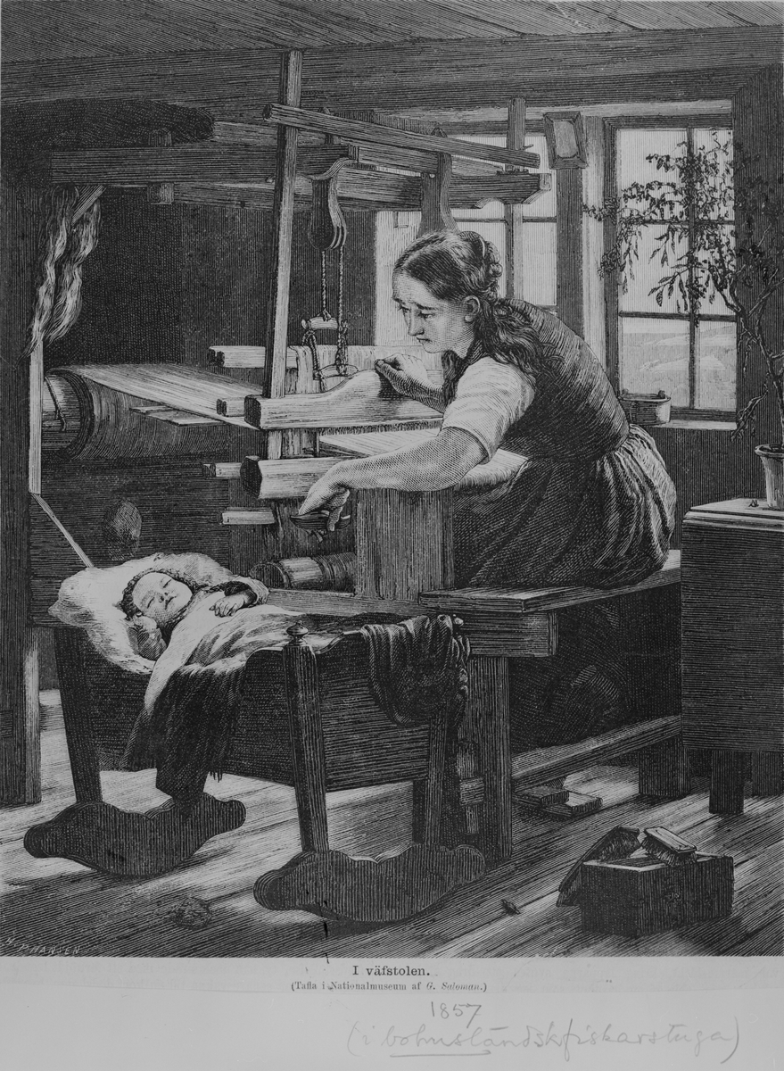 Vävstol i en bohusländsk fiskarstuga 1857. Träsnitt av H. Phansen efter tavla i Nationalmuseum av G. Saloman. Tryckt i Svenska Familj-Journalen 1879.