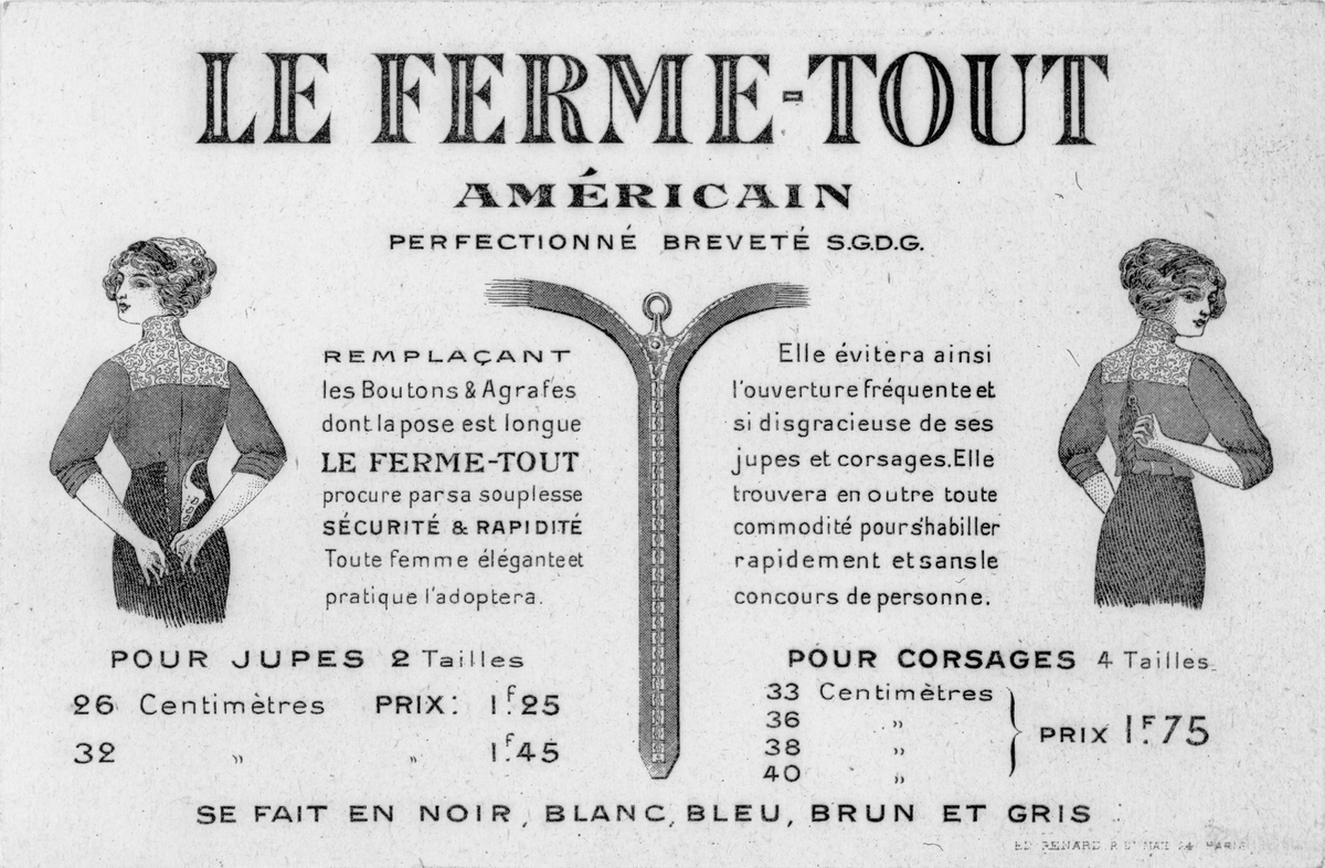 Reklamtryck för amerikanska blixtlåset "Le Ferme-Tout". Konstruerad av P.A. Aronson.