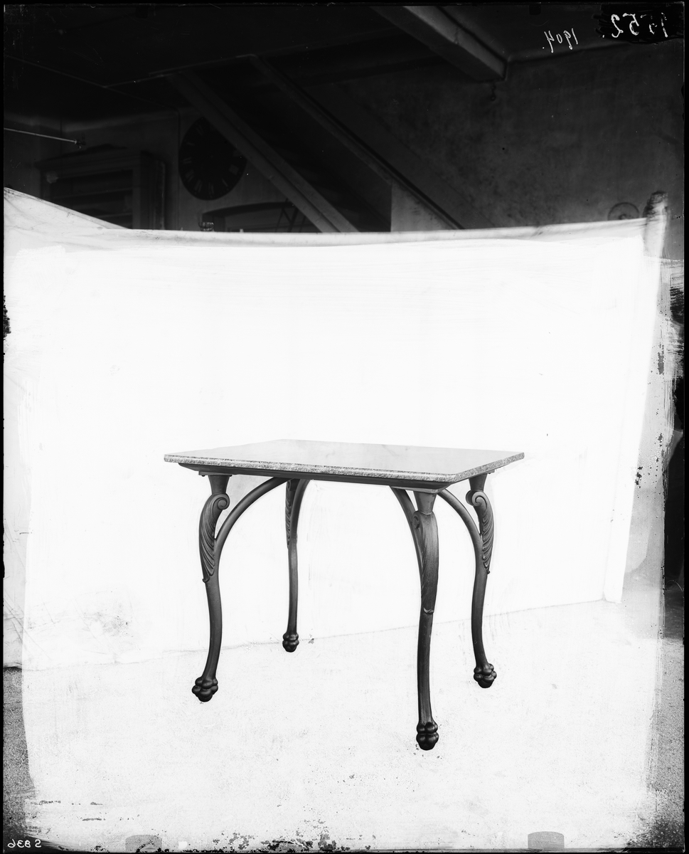 Bord med rektangulär marmorskiva och ben av järnkonstruktion.