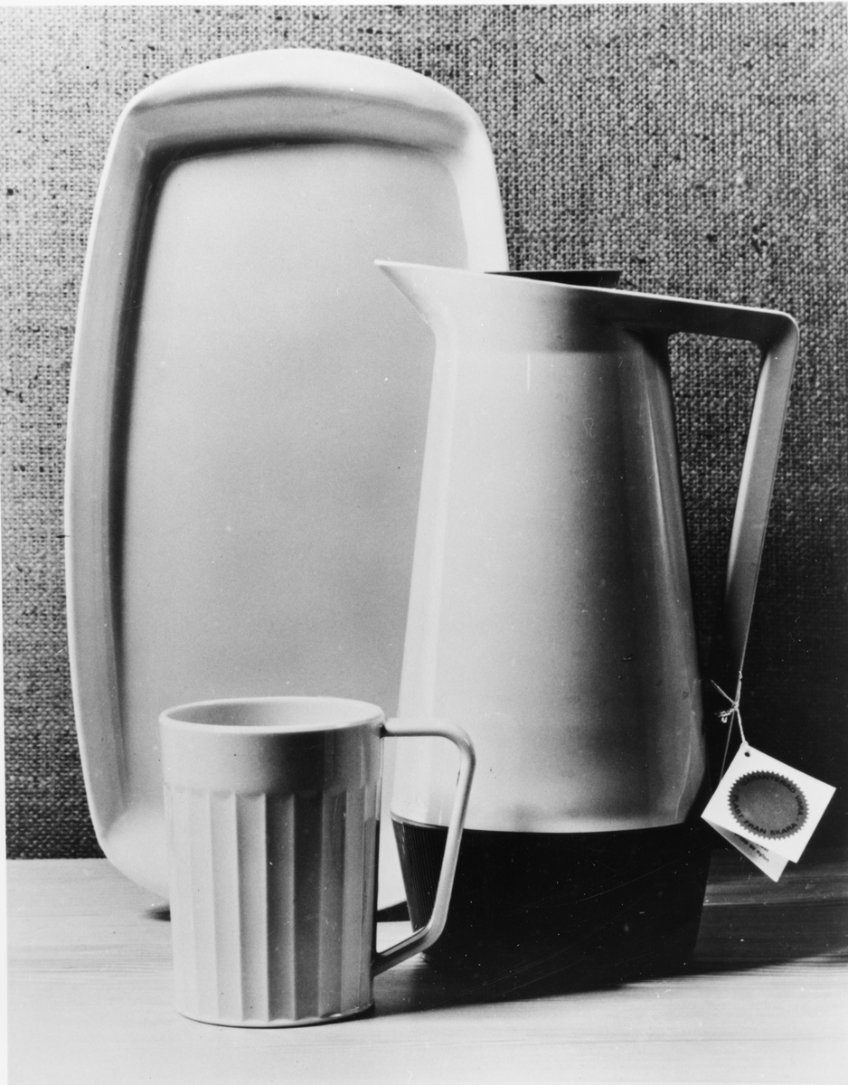 Plastföremål. Termoskanna, mugg och uppläggningsfat.