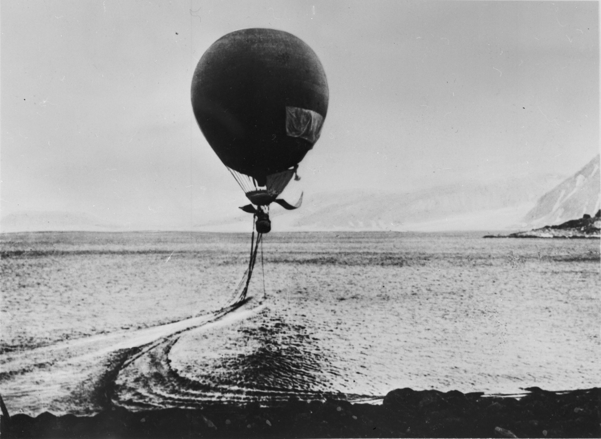 Strax efter starten. Gondolen har snuddat vid vattnet, barlast har kastats och ballongen har åter höjt sig. På grund av barlastlinornas felaktiga upphängning har Örnen vridit sig ett halvt varv. Fraenkel håller på att bärga seglen.