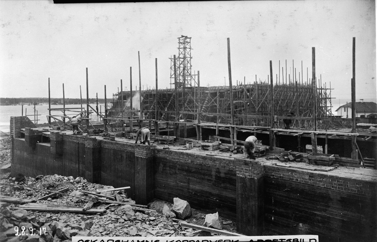 Byggherre: Byggnadsaktiebolaget Contractor, Stockholm. Oskarshamns Kopparverk, arbetsbild.