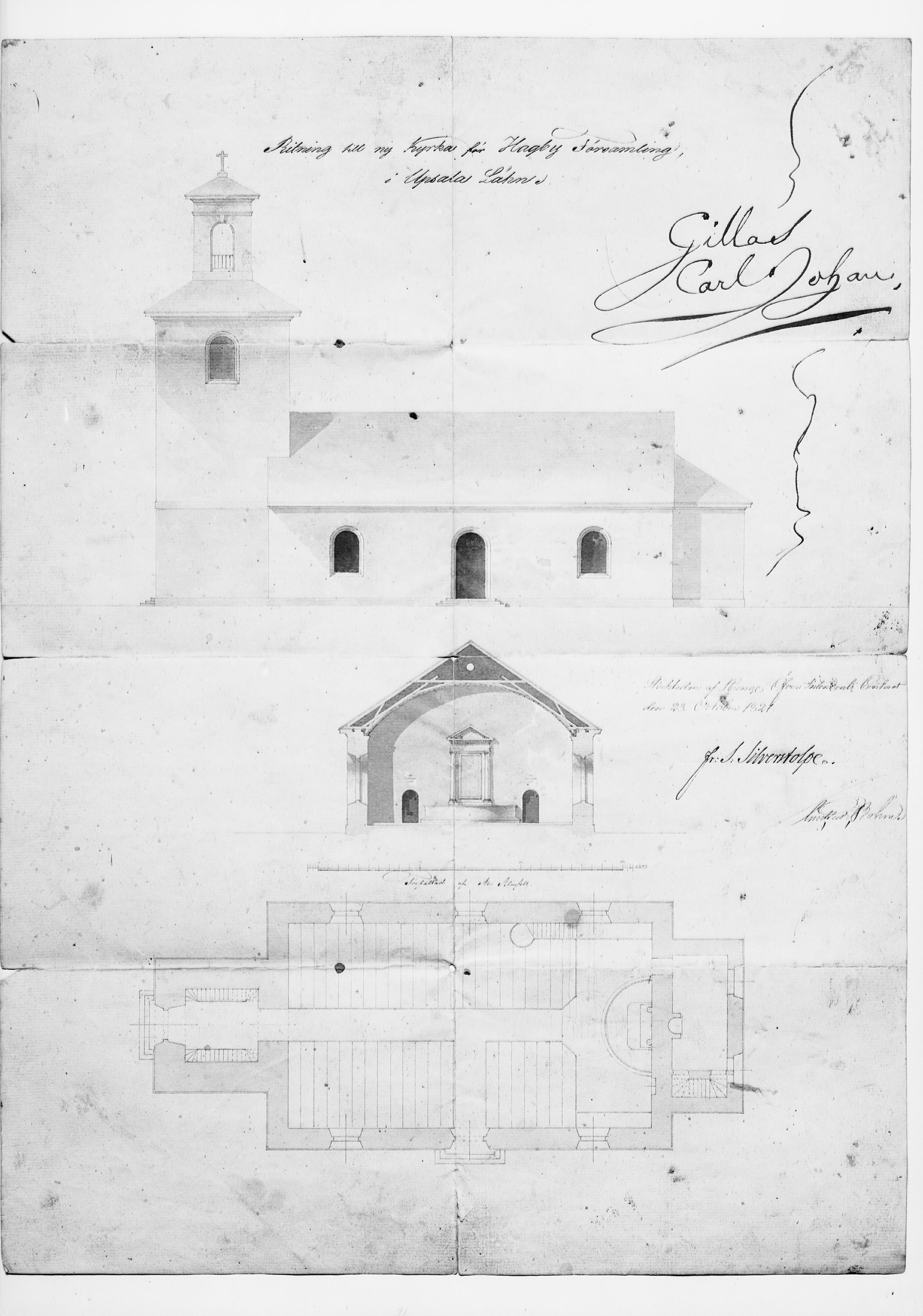 Ritning. Foto efter ritning över kyrkans sydfasad, genomskärning och planlösning.
