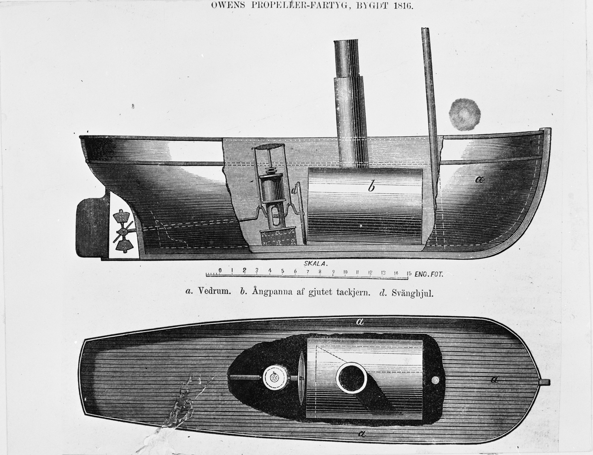 Samuel Owens Propellerfartyg, byggt 1816. Här ses vedrum, ångpanna av gjutet tackjärn och svänghjul. Bilden hämtad från Ny Illustrerad Tidning.