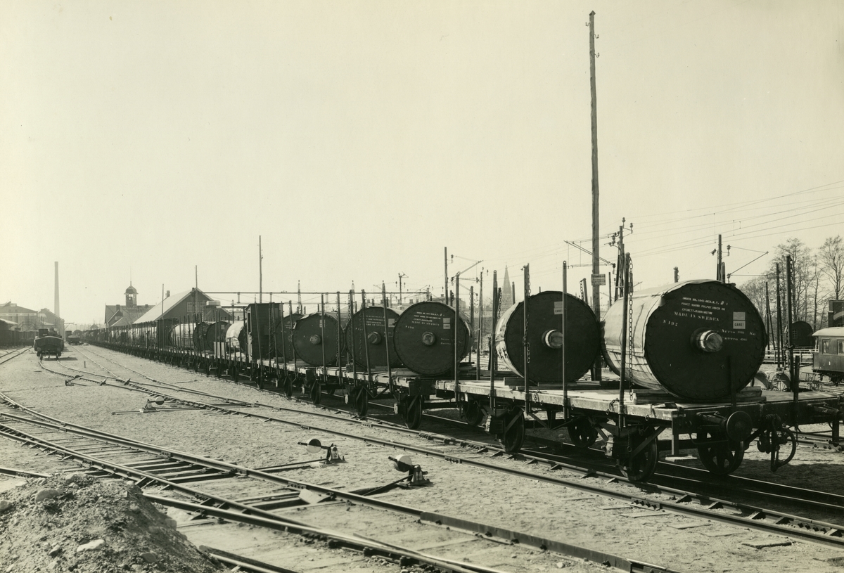45 järnvägsvagnar med maskineri för 2 torkmaskiner för cellulosa. Tillverkade vid KMW för leverans till Puget Sound Pulp & Timber Comp., USA. Ur album för KMW. AB Karlstads Mekaniska Werkstad.