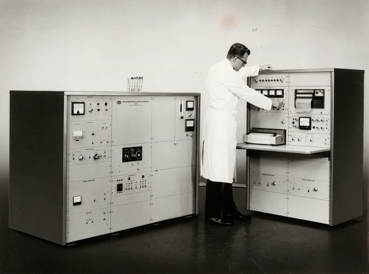 Gaskromatograf - masspektrometer. För separering och analys av biologiska substanser, i mängder ner till 1/100 000 000- dels gram. LKB-produkter AB, Bromma, 1965.
