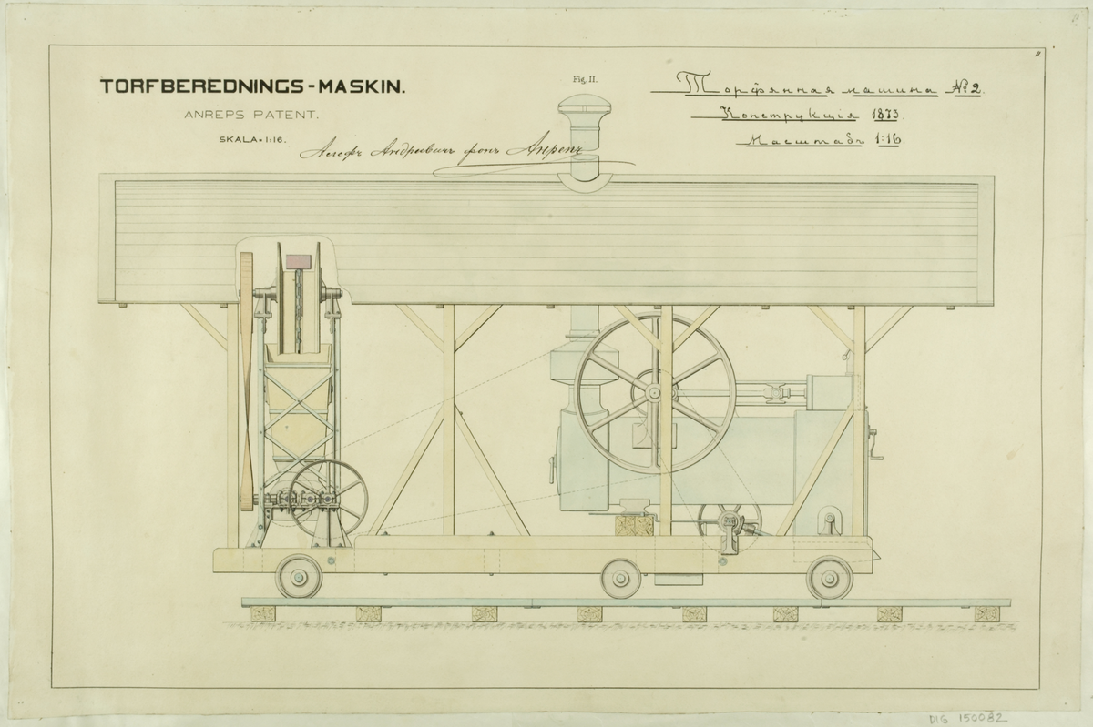Titel: Torfberedningsmaskin Anreps patent 1873, ur boken med ritningar mm 1868-1887, av den svenske torvmaskinkonstruktören Aleph Anrep.