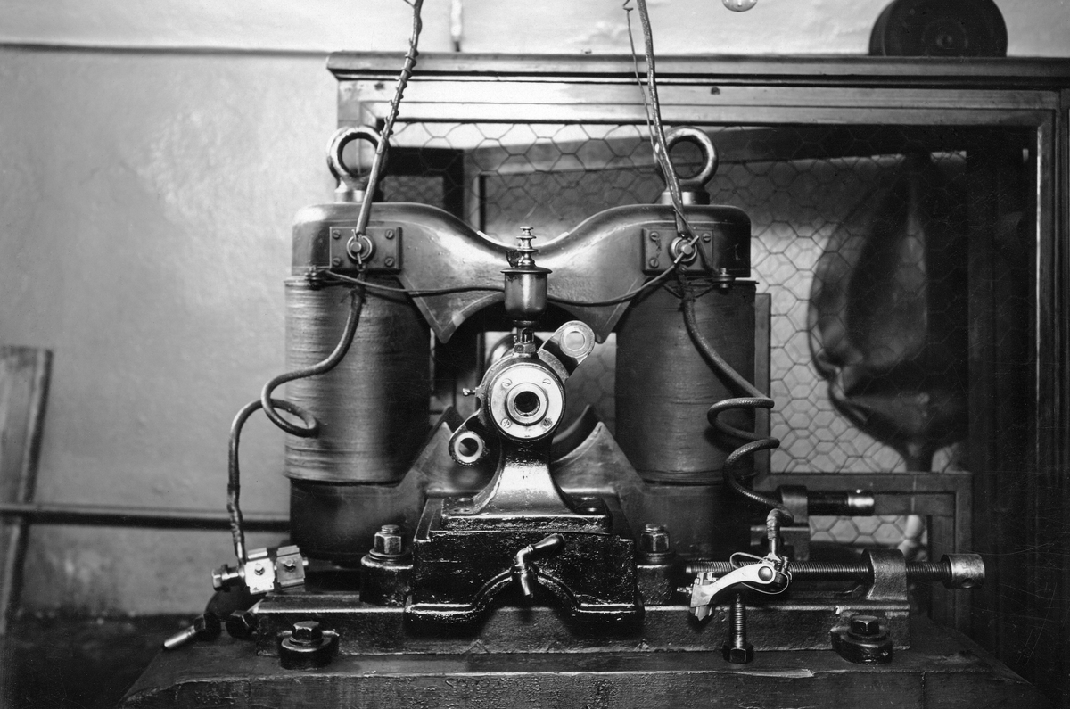 Elektrik belysning allmänt. Generator, remskydd och gummiblåsa för utjämning av gastrycket i ledning till gasmotor.