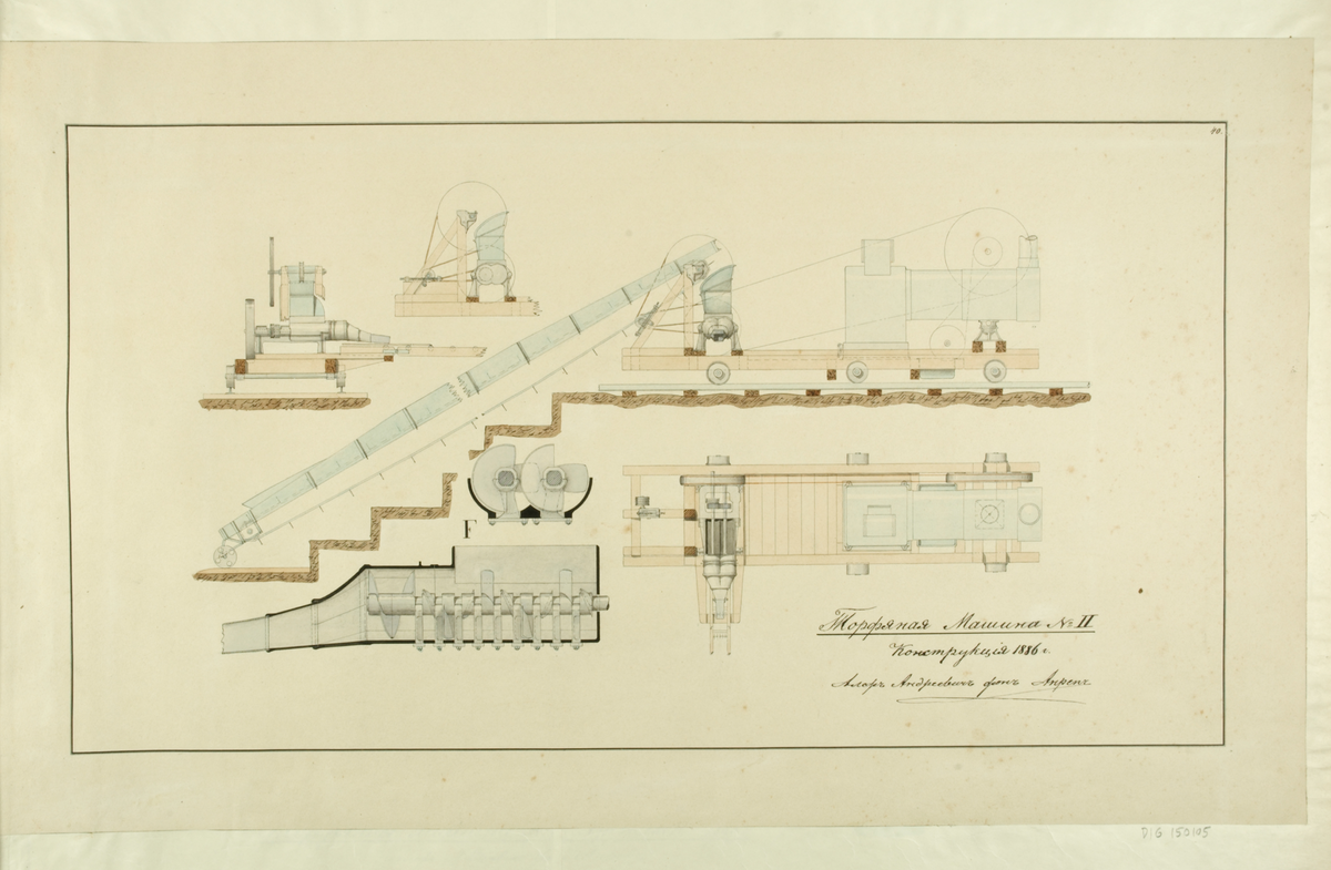 Skiss på ryska, ur boken med ritningar mm 1868-1887, av den svenske torvmaskinkonstruktören Aleph Anrep.