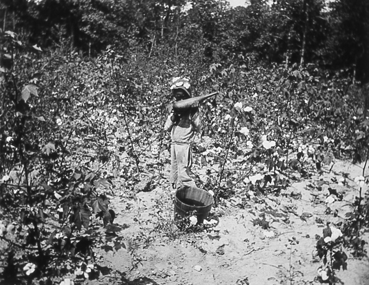 Skioptikonbild med motiv av liten flicka som dricker vatten i bomullsland.