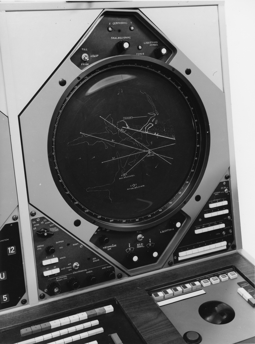 Standard Radiofabrik i Ulvsunda, Stockholm. Närbild av PPI (plan polär indikator) för Arlanda trafikledningscentral visande PEK-symbol, målsymbol för flygplan, pejllinjer, vektorlinjer och inflygningslinjer