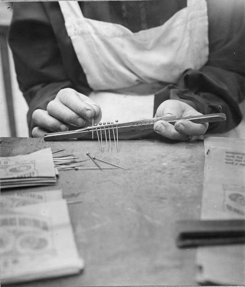 Gusums bruk. Knappnålstillverkning. Instickning av nålar i ett brev.