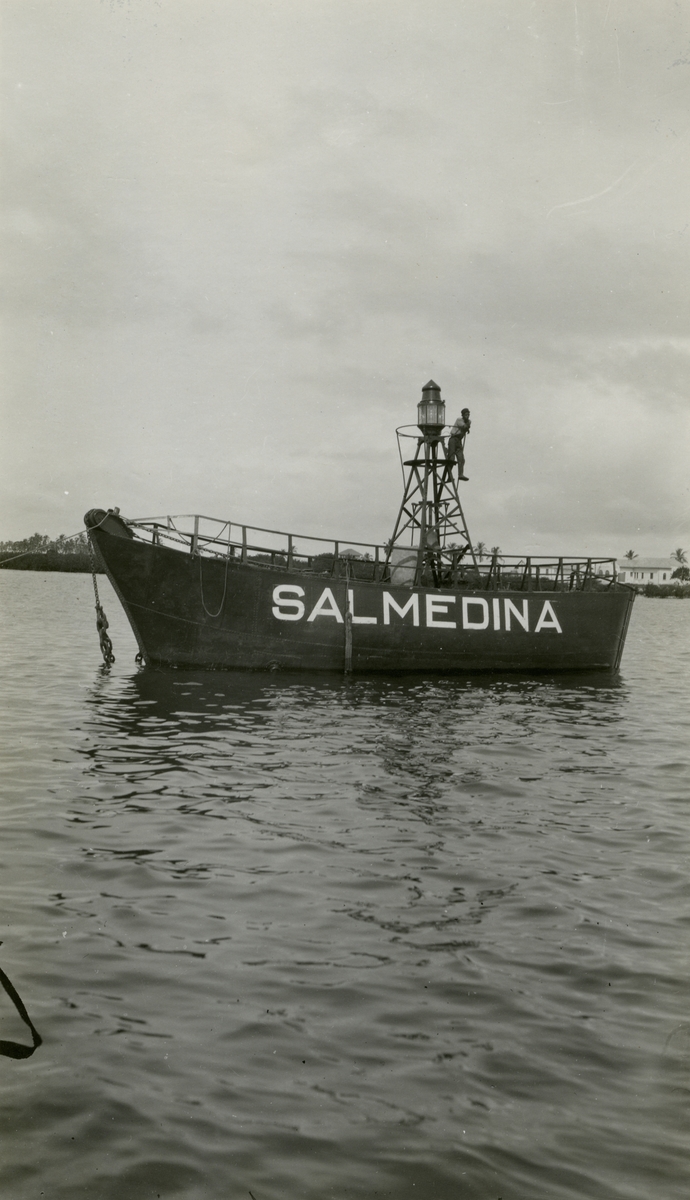 Aga-fyrbåten Salmedina i Karibiska havet. Båtskrovet är byggt efter Agas ritningar på Södra Varvet i Stockholm i februari 1928.
