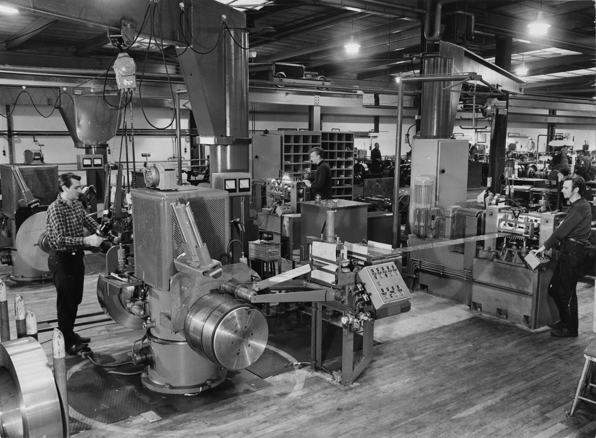 Munkfors Bruk i Värmland. Skärning av kallvalsade band.