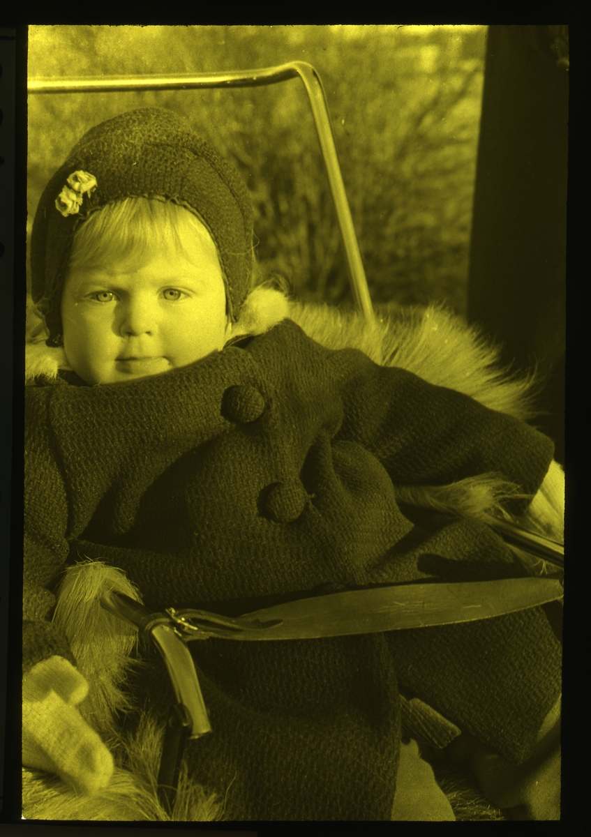 Skioptikonbild från institutionen för fotografi vid Kungliga Tekniska Högskolan. Använd av professor Helmer Bäckström som undervisningsmaterial. Bäckström var Sveriges förste professor i fotografi vid Kungliga Tekniska Högskolan 1948-1958. Flicka i barnvagn. På bilden står skrivet Bet. (betning) i rodankoppar. Tonad i tioflavin + något ?rodamin 1:4 0fix H. Bäckström 1936. För mer info: Se Fotografisk Handbok av Helmer Bäckström. Natur och Kultur. Andra omarbetade upplagan 1958-59. Kap 75-79 (sid 600 och följande.) Toningsförfaranden för silverbilder