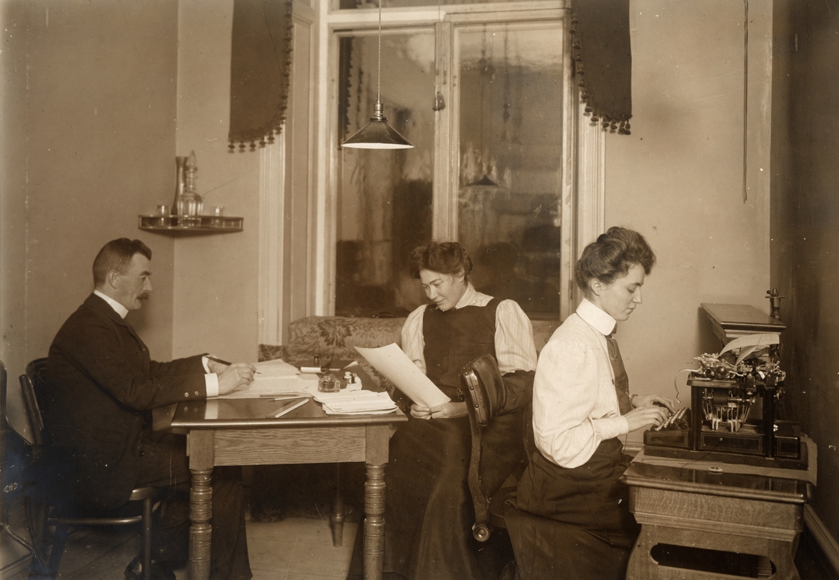 Fotografi ur album tillhörande Ester Holmberg, anställd vid Telegrafstyrelsens statistikavdelning 1902. Fotografierna troligen tagna 1907. Elisabeth Schedin vid skrivbordet och Greta Karlsson vid skrivmaskinen.