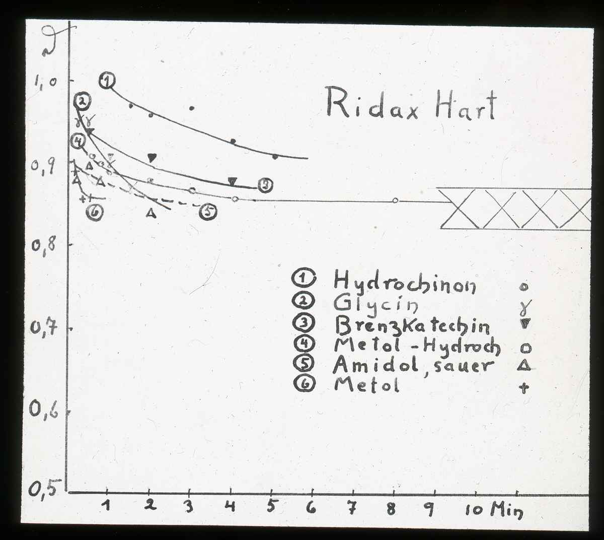 Skioptikonbild från institutionen för fotografi vid Kungliga Tekniska Högskolan. Använd av professor Helmer Bäckström som föreläsningsmaterial. Bäckström var Sveriges första professor i fotografi vid Kungliga Tekniska Högskolan 1948-58. Motiv föreställande "Ridax Hart" (För mer text se bilden).