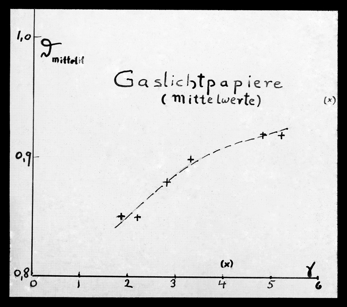 Skioptikonbild från institutionen för fotografi vid Kungliga Tekniska Högskolan. Använd av professor Helmer Bäckström som föreläsningsmaterial. Bäckström var Sveriges första professor i fotografi vid Kungliga Tekniska Högskolan 1948-58. Motiv föreställande "Gaslichtpapiere (mittelwerte)" (För mer text se bilden).