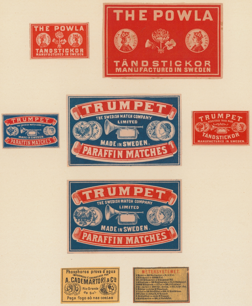 Etiketter för tändsticksaskar, från Svenskt Industri- och Handelsmuseum.