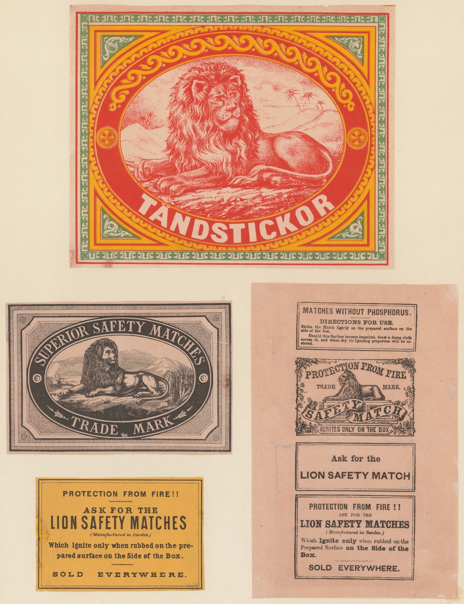 Titel: Etiketter för tändsticksaskar, från Svenskt Industri- och Handelsmuseum. Udevalla - Örebro.
