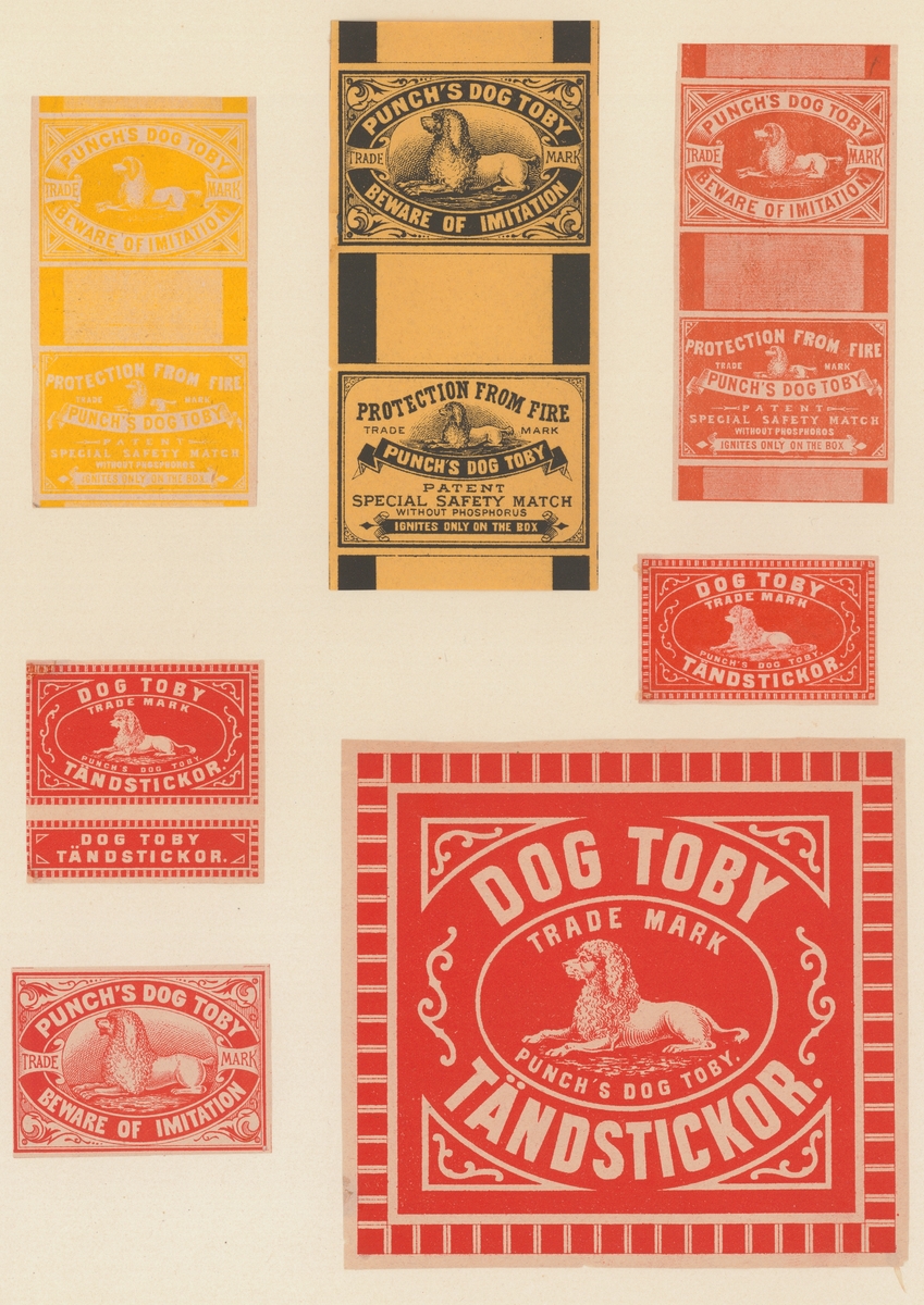 Etiketter för tändsticksaskar, från Svenskt Industri- och Handelsmuseum.