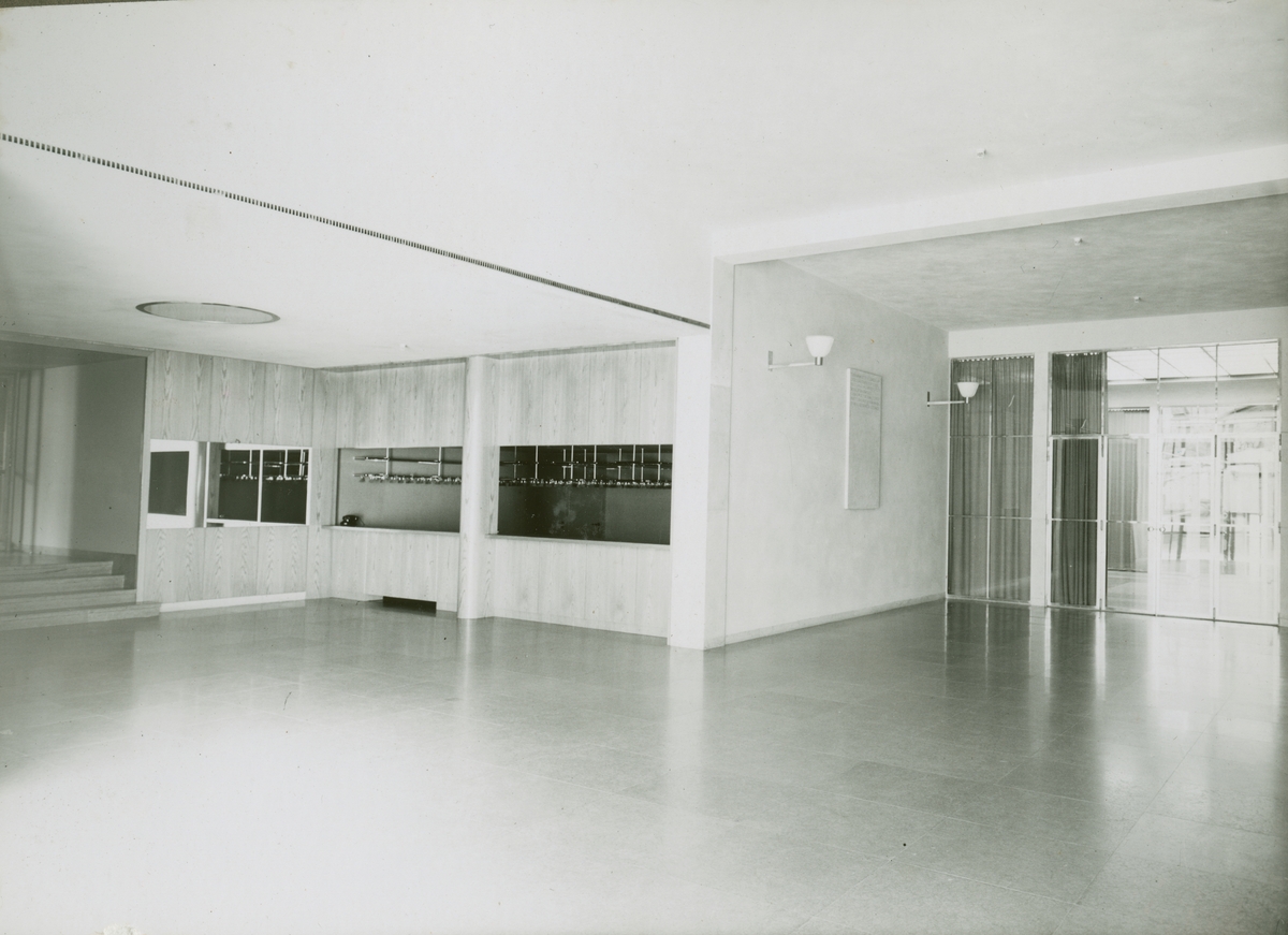 Tekniska museet, ca 1939. Entréhall med garderob. Sverigesalen i bakgrunden.