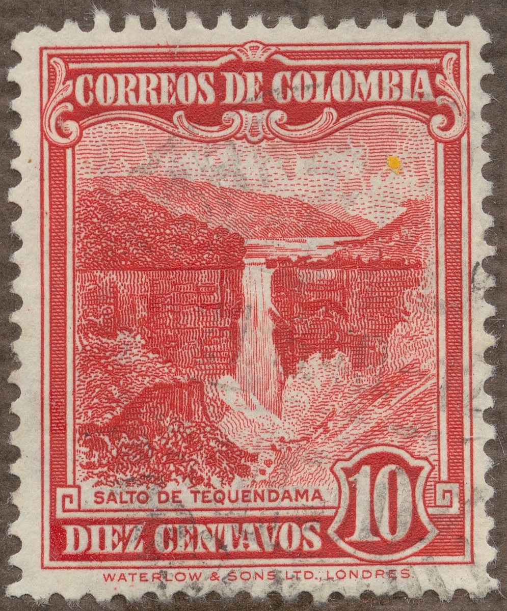 Frimärke ur Gösta Bodmans filatelistiska motivsamling, påbörjad 1950. Frimärke från Colombia, 1948. Motiv av Vattenfallet Tequendama