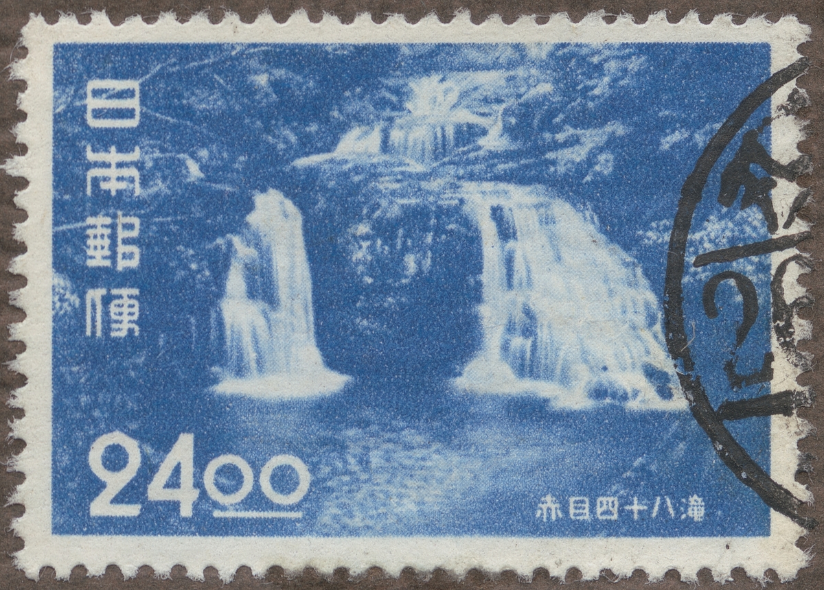 Frimärke ur Gösta Bodmans filatelistiska motivsamling, påbörjad 1950. Frimärke från Japan, 1951. Motiv av Vattenfallet "Ninai-no-taki" i Japan
