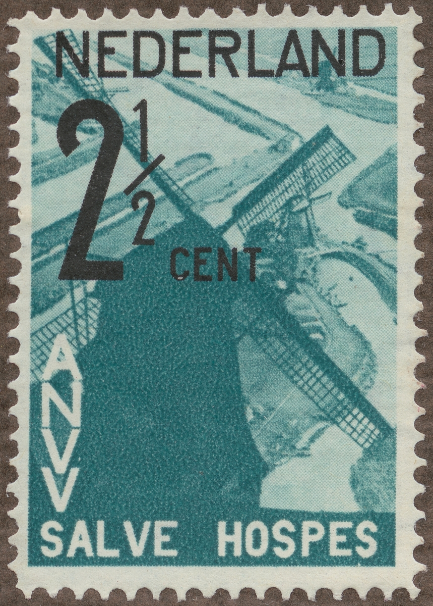 Frimärke ur Gösta Bodmans filatelistiska motivsamling, påbörjad 1950. Frimärke från Nederländerna, 1932. Motiv av Holländsk väderkvarn "Turistpropaganda"