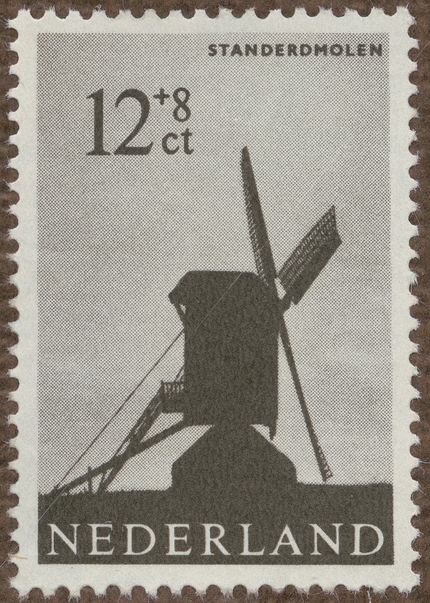 Frimärke ur Gösta Bodmans filatelistiska motivsamling, påbörjad 1950. Frimärke från Holland, 1963. Motiv av Holländsk Stolpkvarn. "-Kvarn-serie till förmån för socialt och kulturellt arbete-"