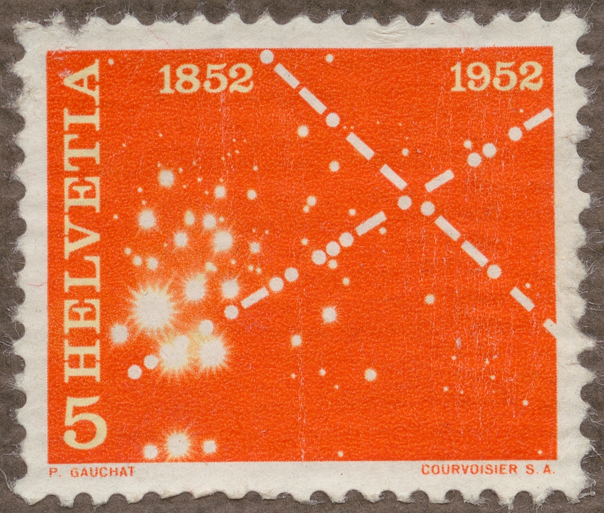 Frimärke ur Gösta Bodmans filatelistiska motivsamling, påbörjad 1950. Frimärke från Schweiz, 1952. Motiv av Symbol för telegrafi "100-årsjubileum 1852-1952"