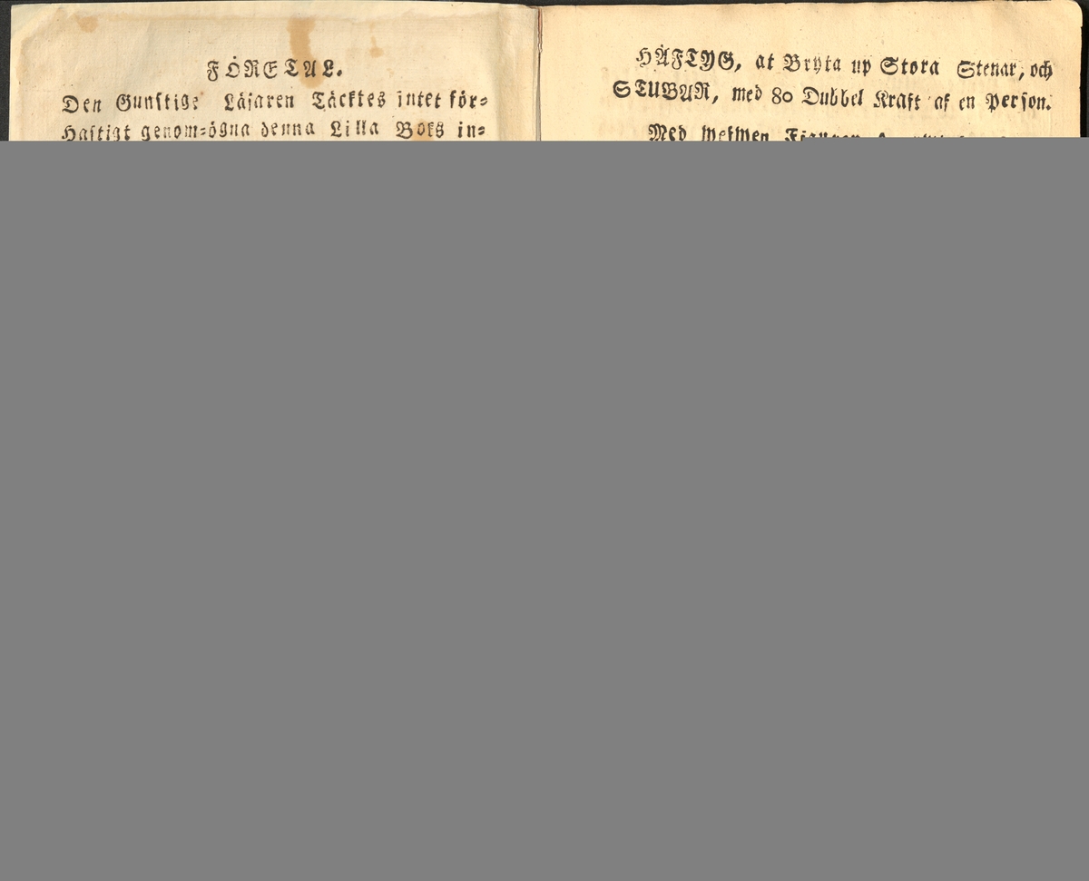 Titel: Bondestolpe. Beskrivningar rörande fångst- och jordbruksredskap. Utgiven av Pontus von Wulfschmidt mellan 1771-1783. Han kunde sedan mot betalning tillverka små trämodeller av föremålen.