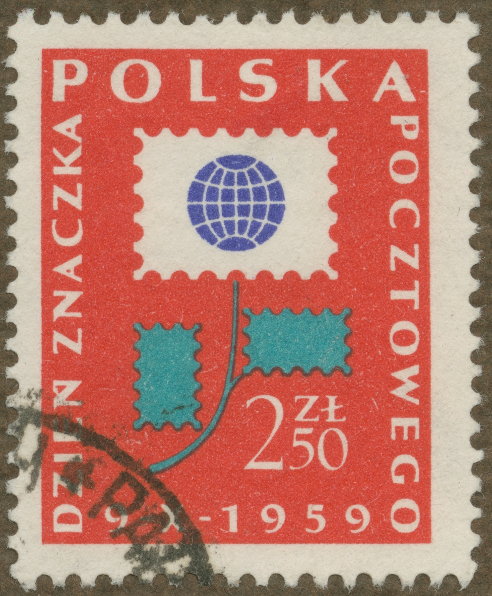 Frimärke från Polen, 1959. Motiv av jordglob i flagga.
