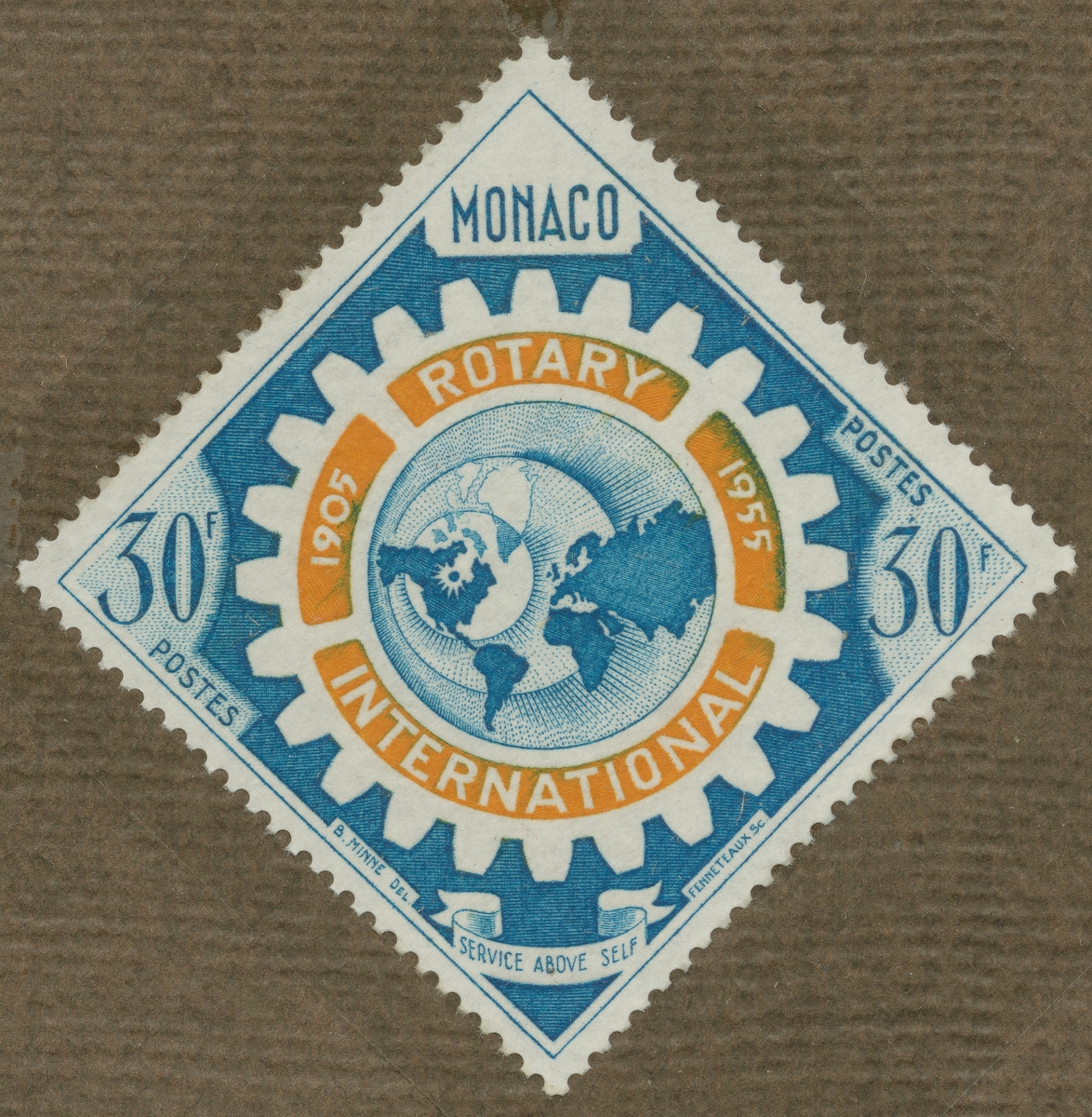 Frimärke från Monaco, 1955. Motiv av världskarta i Rotarysymbol. "Rotary 50 år 1905-1955".