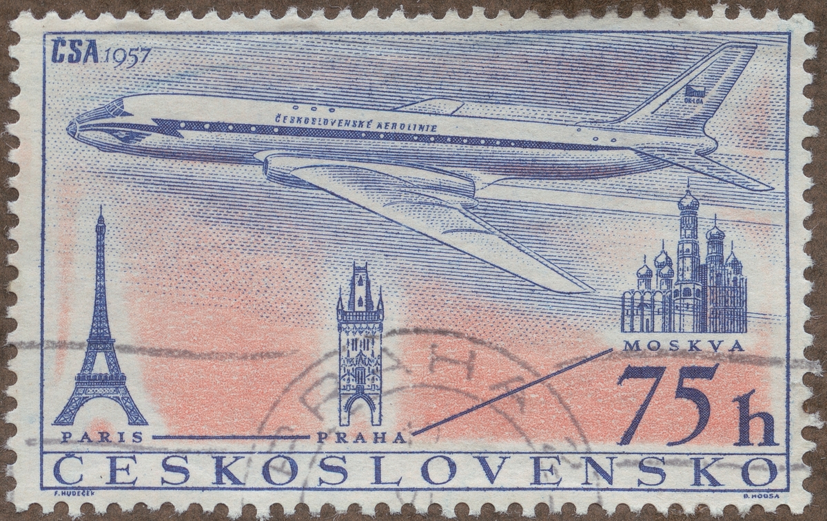 Frimärke från Tjeckoslovakien, 1957. Motiv av Rea-plan "TU-104" Monument: Paris Prag Moskwa "Minne av öppning av rea-plan flyglinjer."