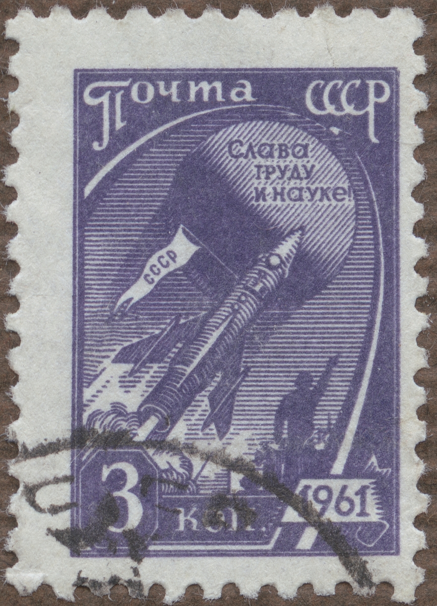 Frimärke från Ryssland, 1961. Motiv av Rysk sputnik och jordglob "(Inskription): "Beröm åt arbetet och vetenskapen"