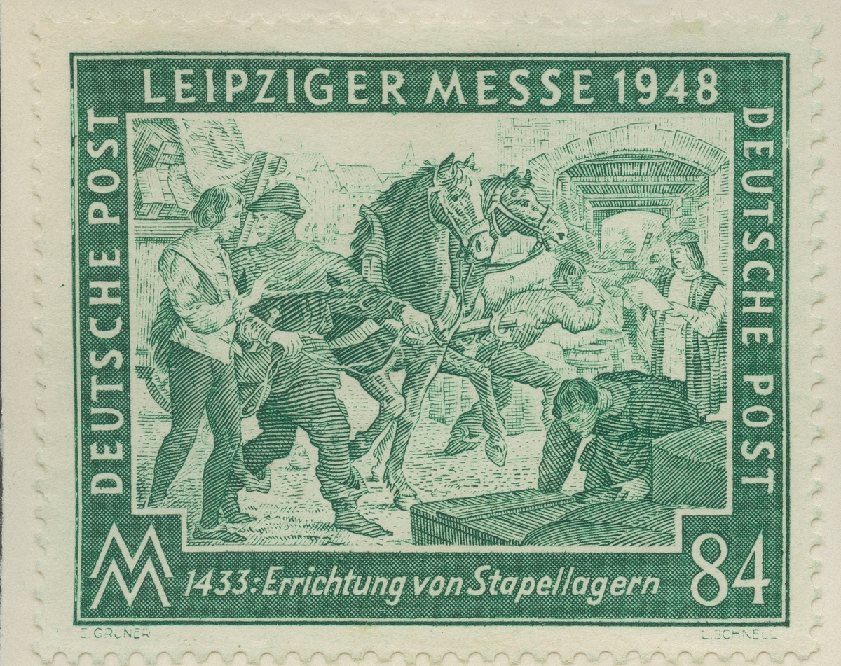 Frimärke från Tyskland, 1948. Motiv av (bild): Uppläggning av stapellager i Tyskland: 1433. -Leipziger Mässan: 1948-